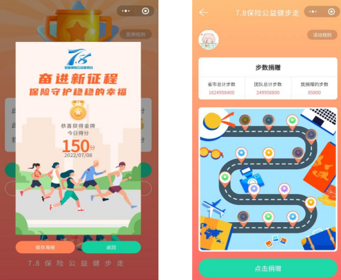根据行业协会开发的“助推乡村振兴、服务老年群体”保险公益健步走微信小程序,各单位各部门积极组织辖内员工和销售人员参与活动并捐赠步数,为需要帮助的地区和人群提供保险保障和公益服务。