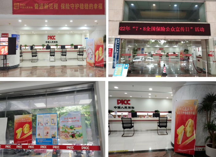 人保财险清远市分公司在7月8日前后充分发挥各级网点的宣传阵地作用,积极运用显示屏、宣传栏、海报等方式,广泛宣传2022年7.8 全国保险公众宣传日活动内容。从7月6日开始,各单位在辖下营业网点的电子显示屏持续播放2022年“7.8全国保险公众宣传日”主题标语,并且在网点显著位置张贴、播放活动宣传海报及视频。在营业网点健全服务老年群体相关服务设施,体现人民保险的温度。