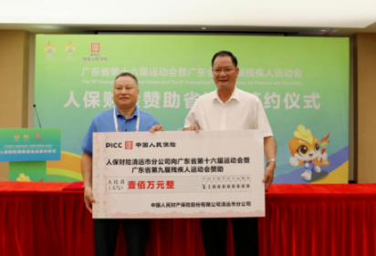 签约仪式上,人保财险清远市分公司向广东省第十六届运动会暨第九届残疾人运动会赞助人民币100万元,支持省运会顺利举办,充分彰显人保财险的责任与担当。省运会筹委会资源开发组副组长、清远市工业和信息化局二级调研员邹俊代表筹委会接受赞助资金。