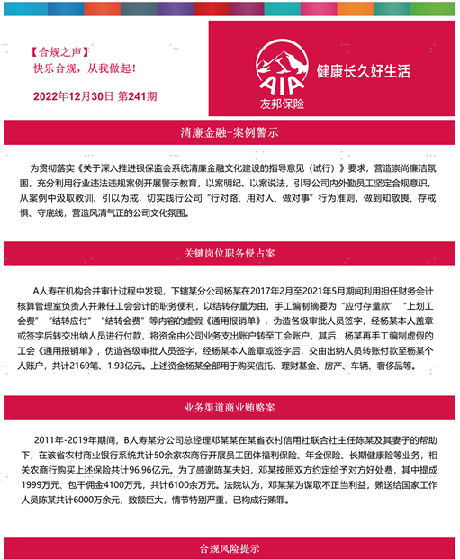 为了进一步强化公司内部监督,推动清廉建设,让全体员工深入了解廉洁文化知识。友邦人寿于近期分别发布了合规之声清廉文化建设专刊《关于<深入推进银保监会系统清廉金融文化建设的指导意见(试行)>解读》《【友清风】关于保险从业人员廉洁自律的“知与行”》《清廉金融文化建设之利益冲突管理重申》《清廉金融-案例警示》,我公司员工通过对以上系列电子期刊开展学习,对行业和公司的廉洁从业要求有了进一步的认识。