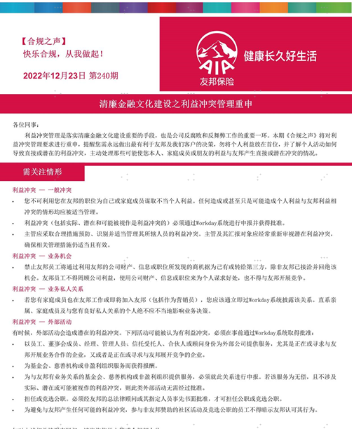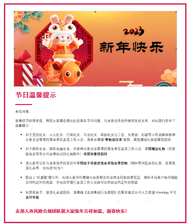 1月18日,友邦人寿通过全员邮件《节日温馨提示》提醒全体从业人员保持高度警惕和清醒认识,始终以诚实和道德的方式开展业务,在任何情况下,都不可以通过贿赂或提供不正当报酬/利益以换取利益和优势。时刻践行公司反腐败、反商业贿赂、反不当竞争等要求。