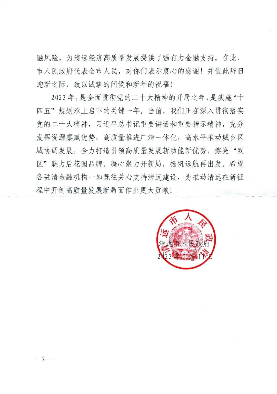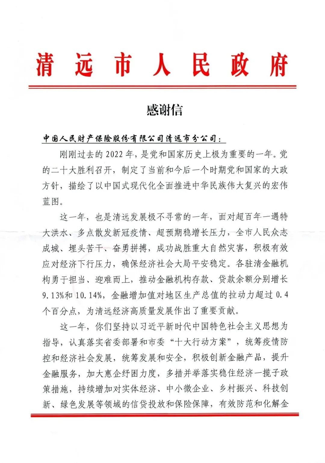 信中还指出,人保财险清远市分公司认真贯彻清远市委“十大行动方案”,统筹疫情防控和经济社会发展,统筹发展和安全,持续增加对实体经济、中小微企业、乡村振兴、科技创新、绿色发展等领域的保险保障,有效防范和化解金融风险,为清远经济高质量发展提供了强有力金融支持,清远市人民政府代表全市人民对清远市分公司表示衷心的感谢,希望人保财险为推动清远在新征程中开创高质量发展新局面作出更大贡献。