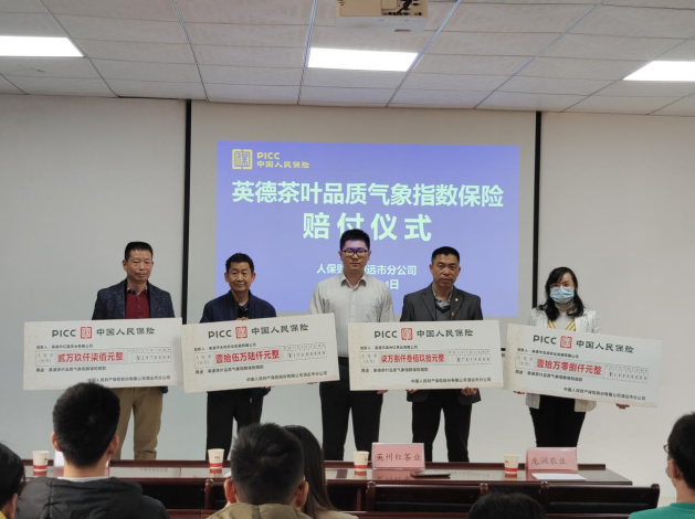2月24日上午,人保财险清远市分公司在英德举行茶叶品质气象指数保险赔付仪式,为英德市龙润农业发展有限公司、英德市永和农业发展有限公司等4家茶企送上茶叶低温冷害理赔款共37.2万元。