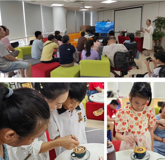 活动中,专业的咖啡师不仅为大家详细讲解了咖啡的各类知识,还精心指导参与者进行手绘雕花图案,让大家能够将这份饱含心意的作品送给心爱的人。参与者们沉浸其中,用心绘制着独一无二的图案,现场充满了温馨与甜蜜。
