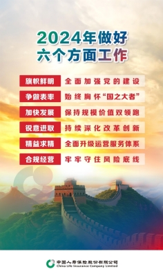 中国人寿寿险公司董事长白涛在视频讲话中指出,过去一年,公司顶住外部压力,克服困难,用良好的业绩贯彻落实了党的二十大精神。展望2024年,白涛指出,中央金融工作会议和中央经济工作会议为新时代新征程推动金融高质量发展提供了根本遵循和行动指南,寿险公司必须坚定贯彻党中央的决策部署,奋力开创高质量发展新局面。白涛提出六点要求:一是强化党建引领;二是坚持胸怀大局;三是勇于领先领跑;四是突出质效并举;五是加快改革创新;六是守好安全底线。