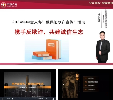 为响应行业号召,加强员工对保险欺诈的防范意识与应对能力,构建诚信保险生态环境,中意人寿清远中支认真组织全体员工参与了由总公司运作部(消费者权益保护部)举办的“携手反欺诈,共建诚信生态”培训。此次培训于 2024 年 11 月 14 日正式上线,全体内外勤员工通过意学堂平台进行了自主课程学习。