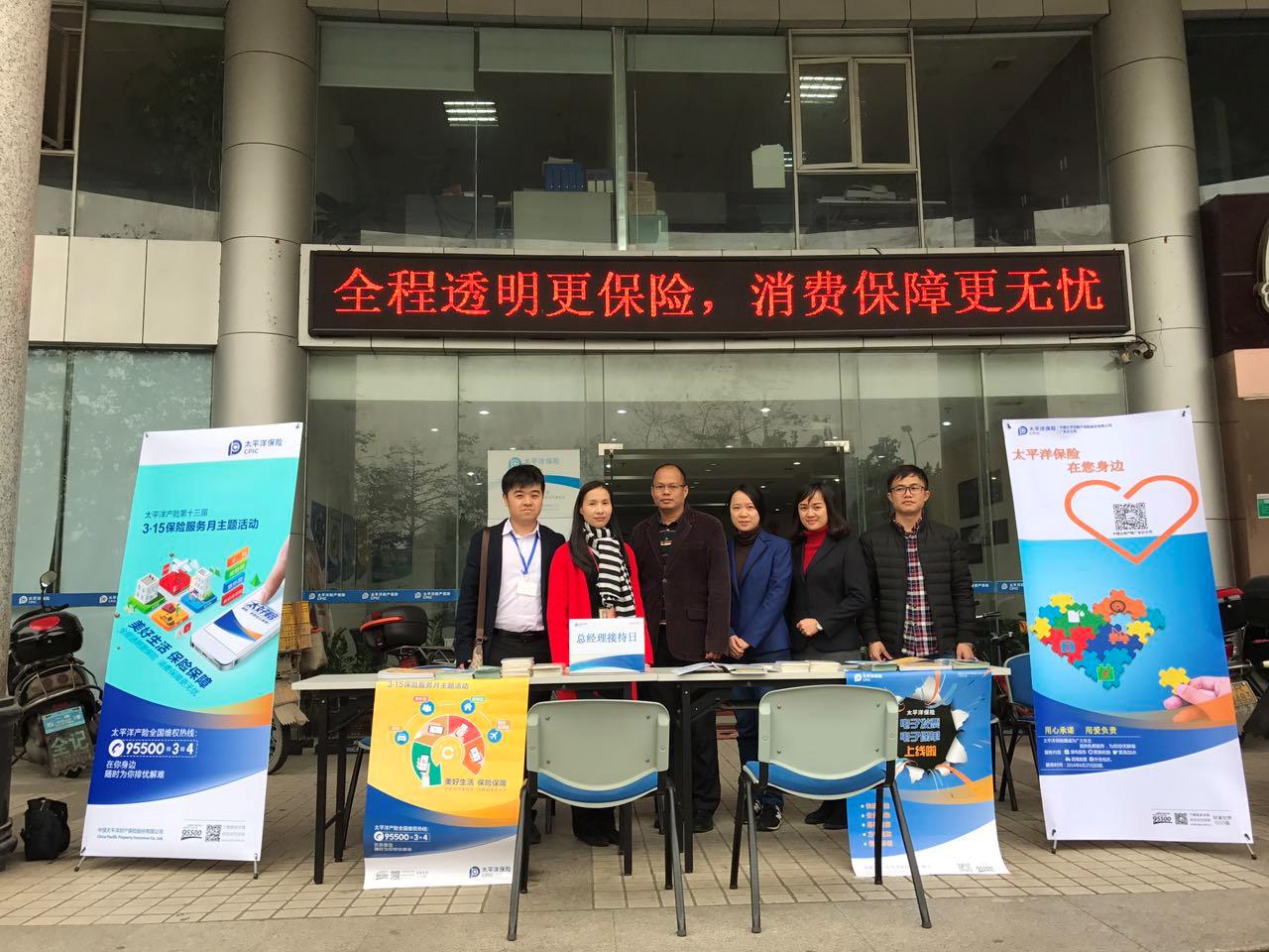 2017年3月15日上午,在分公司和清远市保险行业协会的支持指导下,太保产险清远中支在本部大楼外开展了“3.15” 保险服务月主题活动。