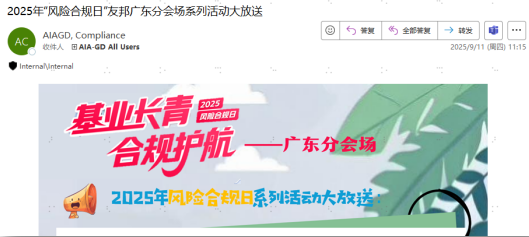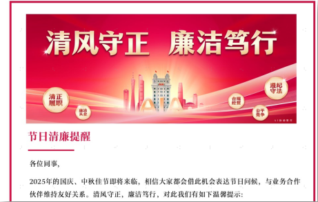 9月28日,友邦清远通过分公司全员邮件向员工发出“2025年国庆中秋清廉节日提醒”,旨在进一步强化公司作风建设,营造风清气正的节日氛围。该提醒重申了与国家公职人员交往须严格遵循“零物质往来”原则、要求员工严格遵守公司关于礼物与招待的相关规定与内部申报流程、牢记在与业务伙伴的来往中不得给予或接受现金或现金等价物。此外,公司还提醒员工在日常工作中需遵循与业务相关的法律法规和监管规定,通过发布反贿赂及反腐败提示,引导员工坚守廉洁自律、诚信经营、公平竞争和服务社会的金融行业核心价值观和行为规范。