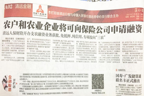 7月26日,清远日报对人保财险清远市分公司开展支农融资业务进行报道,有效扩大公司支农融资业务险种优势和提高品牌影响力。