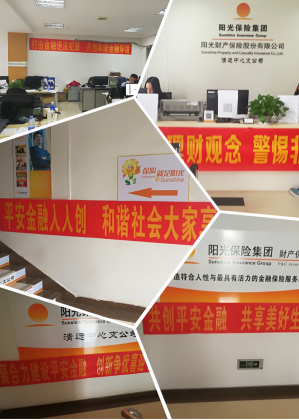 9月整月为平安金融宣传月,清远中支主要采用以横幅悬挂的宣传形式,在中支职场内外主要显眼处悬挂宣传标语,意在为迎接党的十九大胜利召开,让平安金融、平安广东理念深入人心,积极营造“平安金融人人有责、人人参与、平安成果人人共享”的浓郁氛围。(阳光产险 李秋红)