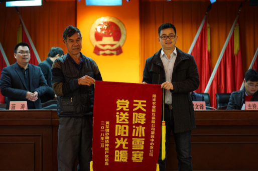 2018年2月9日,“清远市政策性砂糖桔种植保险理赔现场会”在阳山县七拱镇召开。现场发放仪式向阳山县17户砂糖桔种植农户共发放理赔款400万元。现场会上,七拱镇政府、各砂糖桔获赔农户向阳光农业相互保险公司赠送了十几条锦旗,农户代表欧炳森更是将市委葛书记亲笔题词“天降冰雪寒 党送阳光暖”制作成锦旗亲手送到了阳光公司手上。