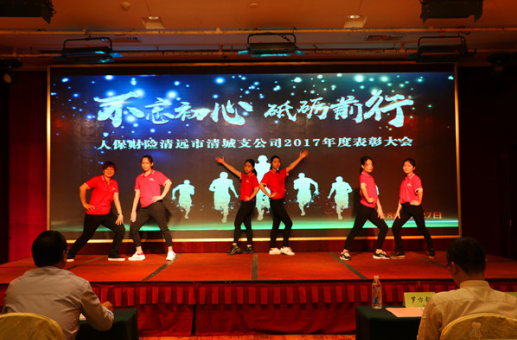 大会开始前,首先播放了倒数10秒的视频,具有冲击力的画面,穿透力十足的声音,为大会营造了充足的气氛。紧接着,清城支公司六位精英身穿人保运动服,带来充满活力的开场舞,正式拉开表彰大会序幕。